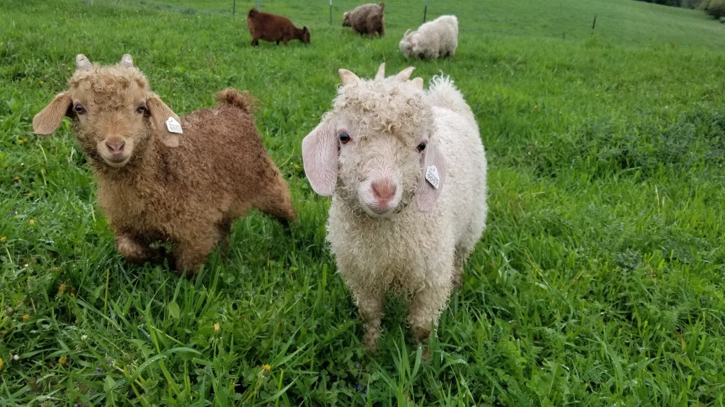 Our little Goat flock is a family of Angoras and Nigoras. They are sweet, gentle animals who produce soft, lustrous mohair (angora) and cashmere like (Nigora) fiber. http://www.cagba.org/.